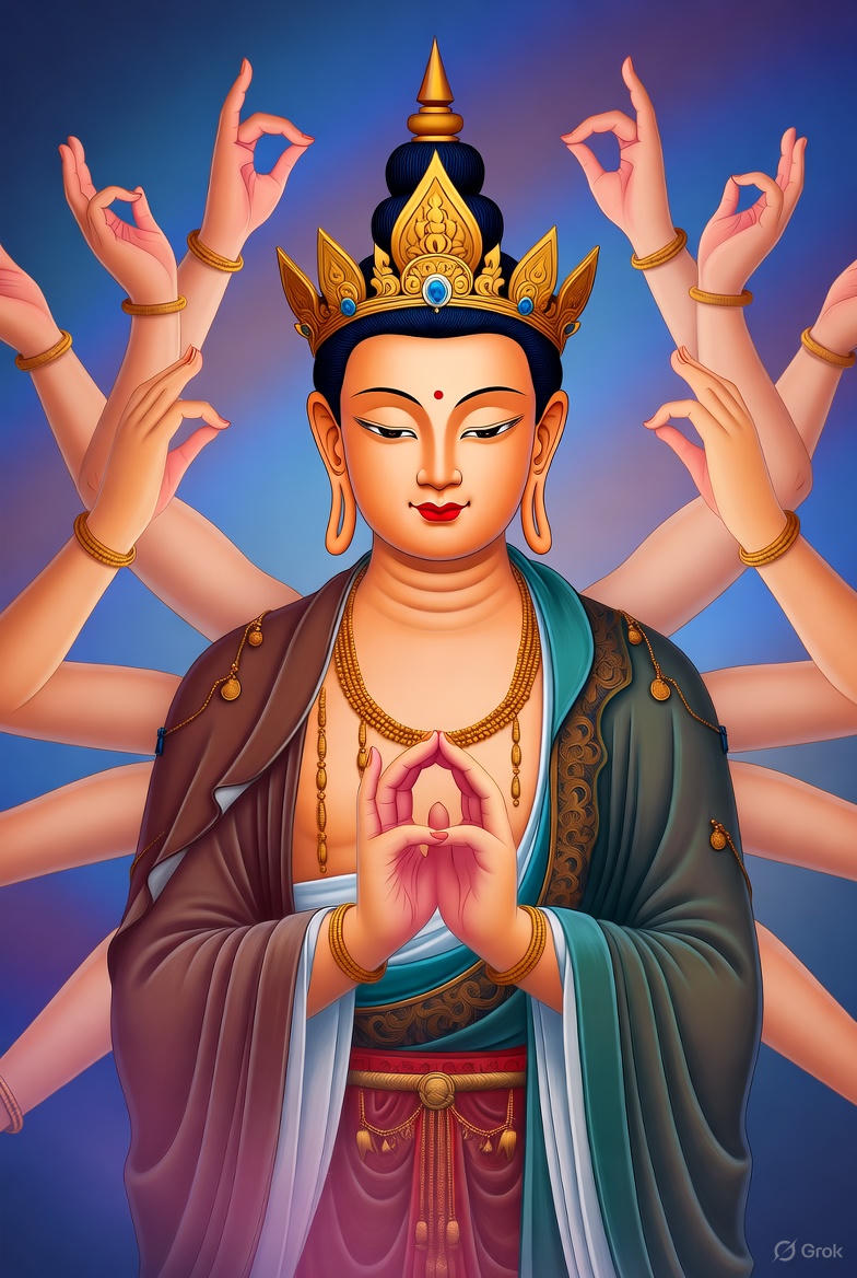세음보살: 중생의 고통을 구제하고 소원을 들어주는 보살로, 42가지 수인을 통해 다양한 중생의 고통을 구제한다고 합니다.